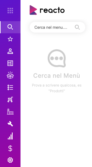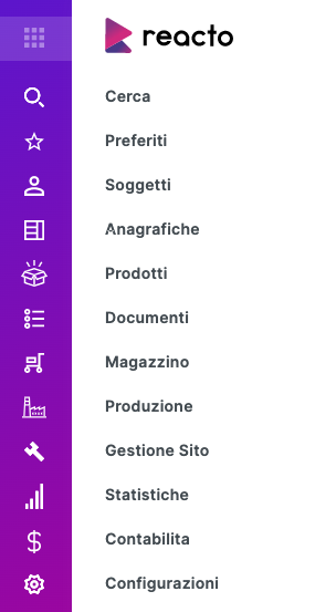 Reacto offre la possibilità di gestire i preferiti per accedere rapidamente ai menu utilizzati più di frequente. Per aggiungere una scorciatoia ai preferiti, apri il menu laterale, clicca sull'icona a forma di stella e poi seleziona Gestione Preferiti per accedere al pannello dedicato.