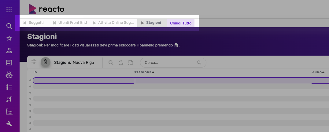 Reacto ha UX reattiva, il pannello si modifica durante l'inserimento dati per rendere più intuitivo l'utilizzo del software. Una volta sbloccato il pannello con il pulsante lucchetto, appaiono nella toolbar i pulsanti per il salvataggio, la cancellazione e la duplicazione delle righe.